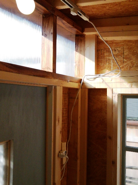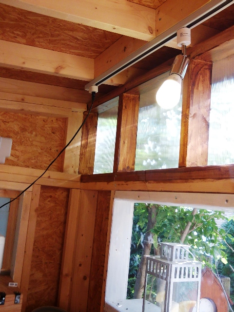 さらにここから、今度は室内用の延長コードと節電タップと、ライティングダクトレールを使って照明を付けました。