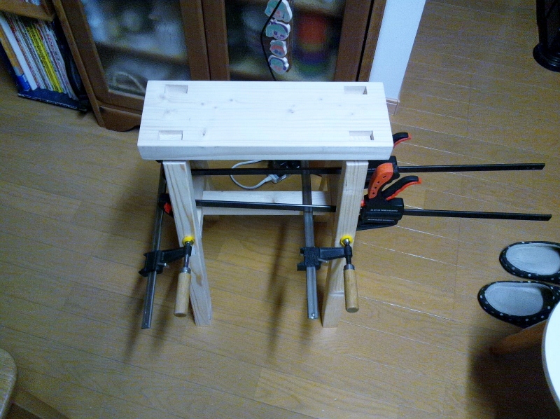 で、ボンドが乾いたら、当て木をして座面を最後まで叩き込みます。