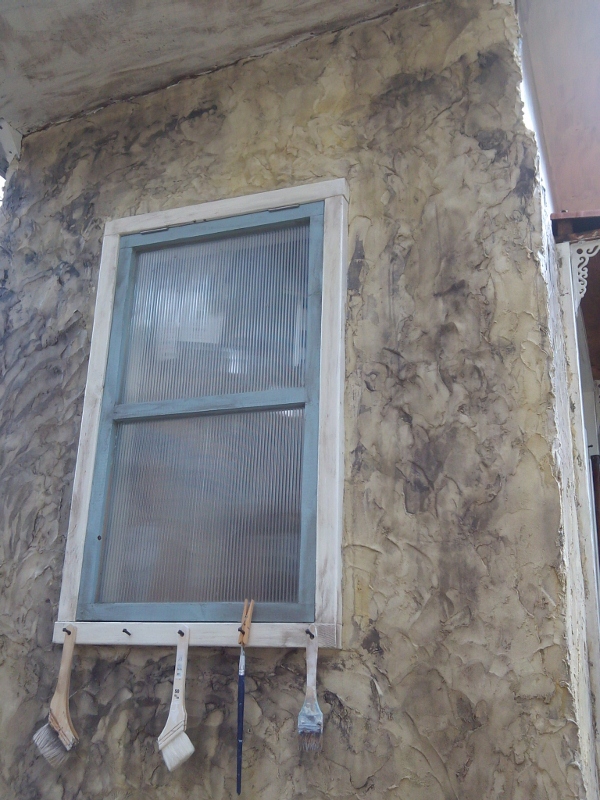 窓の下には、アンティーク釘を打ち付けて、筆を掛けました。